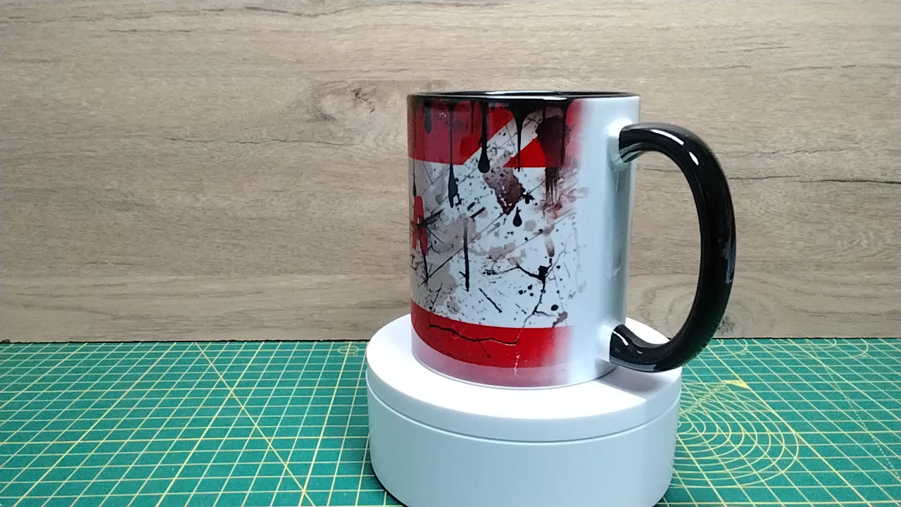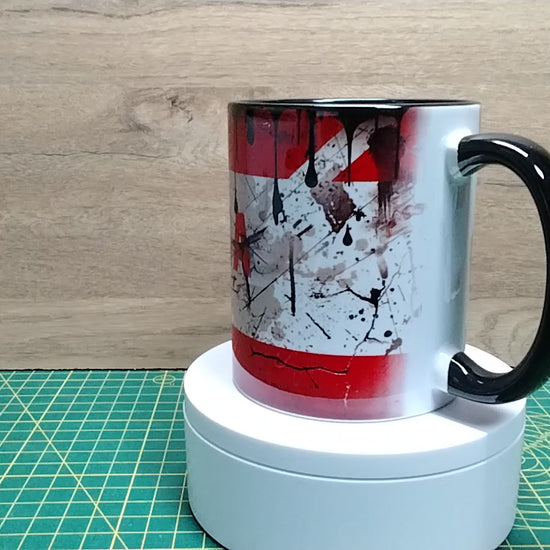 Ceramic mug featuring a distressed, grunge-style design inspired by Honda graphics. The exterior has a weathered, splattered look with bold red detailing, and the interior is finished in glossy black. Ideal for motorbike enthusiasts and collectors. Suitable for daily use with hot or cold drinks.
